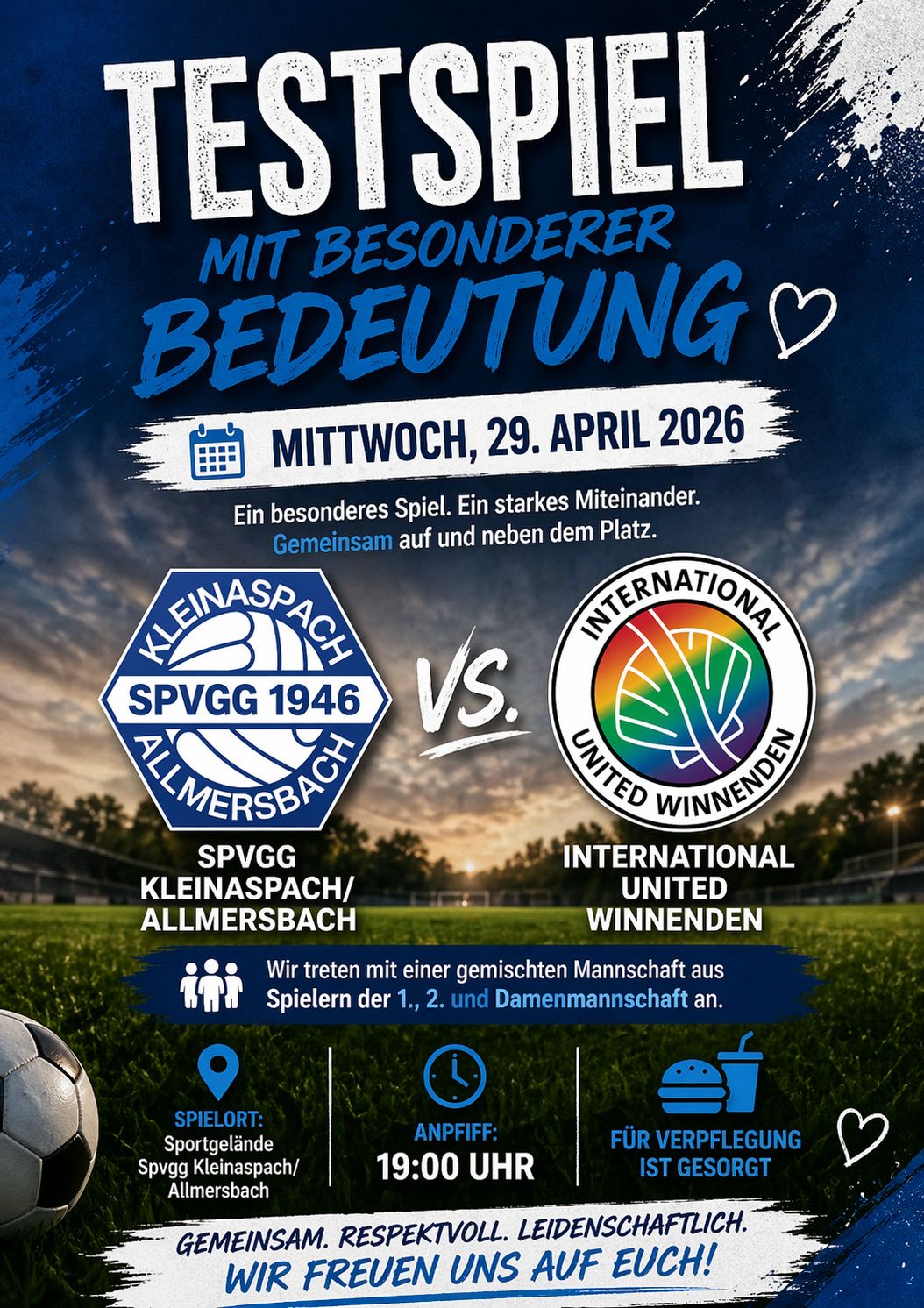 Am Mittwoch, den 29. April 2026, steht für die Spvgg Kleinaspach/Allmersbach ein ganz besonderes Testspiel an. Um 19:00 Uhr treffen wir auf International United Winnenden, den Fußballverein der Paulinenpflege Winnenden.